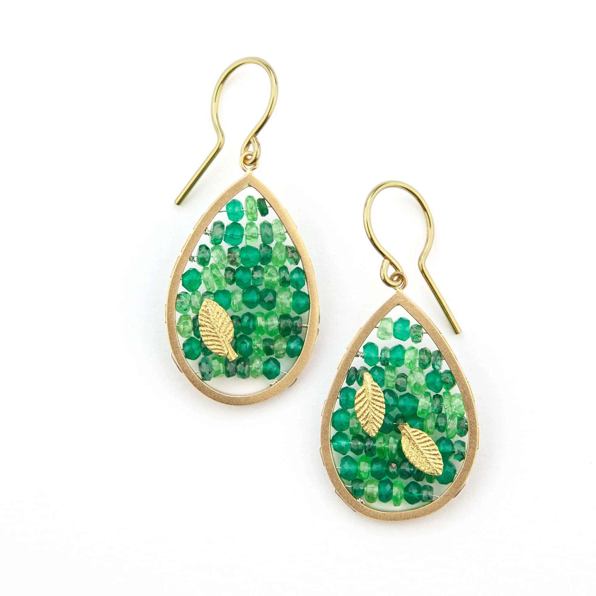 Precious and semi-precious gemstone beads are woven into frames of gold and oxidised silver. Bold and graphic, each piece is unique and made by hand.